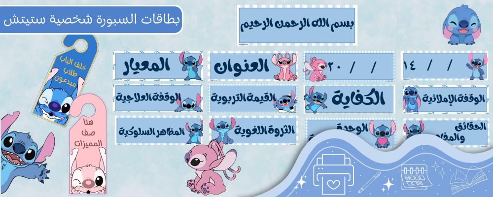 بطاقات سبورة قياساتها ( العرض 30 سم والارتفاع 12 سم ) بتصميم الشخصية اللطيفة ستيتش تحمل عبارات منوعة تخدم مجموعة من المواد التعليمية وتضفي على الصف جوا من المرح والجمال والديكور المحبب للطلاب في مراحل التعليم المبكرة .