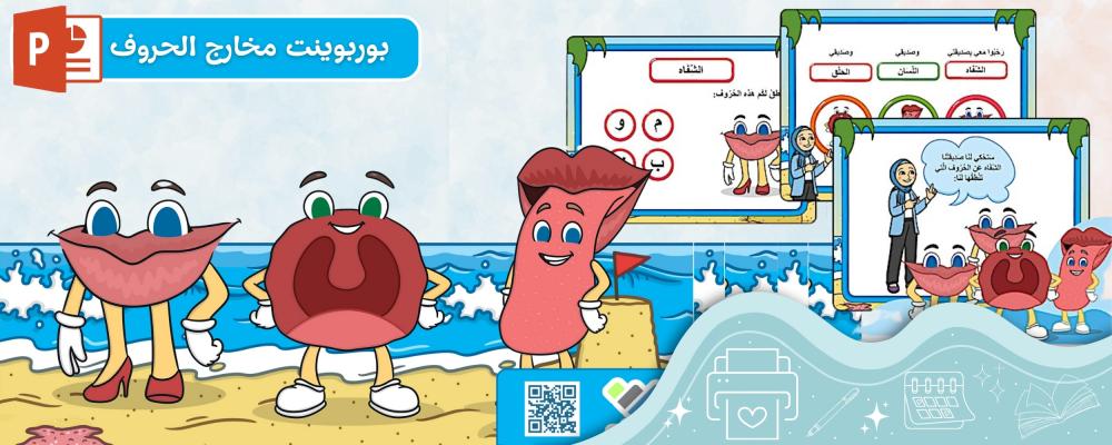 بوربوينت عبارة عن عرض تقديمي من 26 شريحة قابلة للتعديل والذي يحتوي على تعريف بمخرج الشفاه وأيضًا الحروف التي تنطق من مخرج الشفاه، كما يوجد أيضًا تعريف بمخرج اللسان والحروف التي تنطق من مخرج اللسان، وأخيرا مخرج الحلق والحروف التي تنطق من مخرج الحلق، كما يحتوي أيضًا عن مجموعة من التدريبات والتمارين من أجل التغذية الراجعة ولتاكيد فهم أنواع المخارج الثلاثة وإدراك التلاميذ لحروف كل مخرج من المخارج